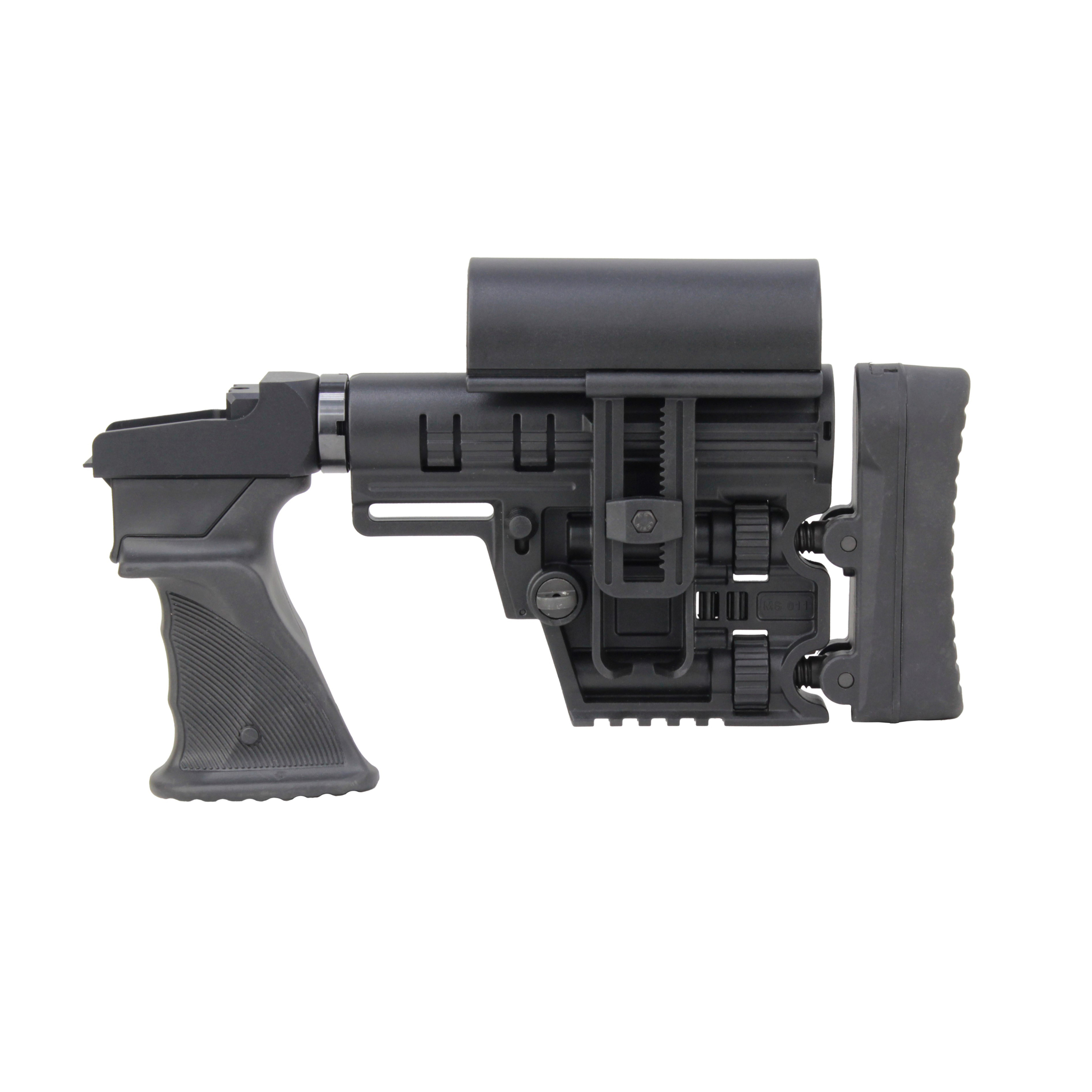База приклада DLG011 – большое кол-во настроек во всех проекциях, для максимально удобной вкладки. Классическая телескопическая настройка, настройка отдаленности затыльника и его наклон 2мя шестернями, настройка высоты затыльника, точечная настройка высоты подщёчника. Подщёчник двигается в горизонтальной плоскости;